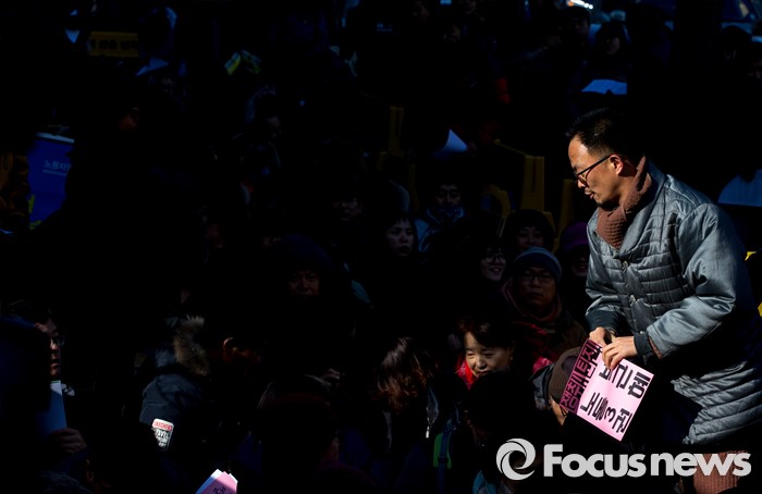 (서울=포커스뉴스) 21일 오후 서울 서초구 서울중앙지방법원 인근에서 열린 전교조 탄압 분쇄 결의대회에서 한 참석자가 자리로 향하고 있다.