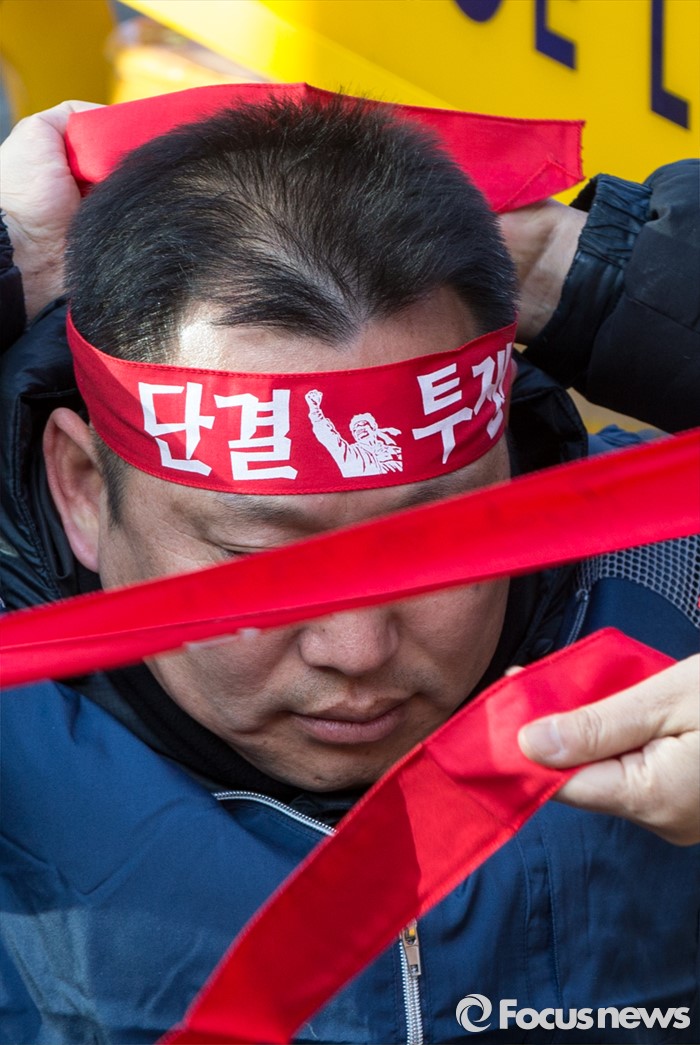 (서울=포커스뉴스) 21일 오후 서울 서초구 서울중앙지방법원 인근에서 열린 전교조 탄압 분쇄 결의대회에서 한 참가자가 머리띠를 두르고 있다.