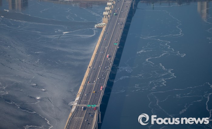 (서울=포커스뉴스) 서울 기온이 영하권에 머무르며 연일 강추위가 이어지고 있는 21일 오후 서울 한강이 얼어 있다.