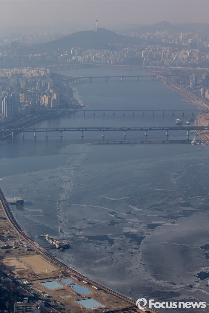 (서울=포커스뉴스) 서울 기온이 영하권에 머무르며 연일 강추위가 이어지고 있는 21일 오후 서울 한강이 얼어 있다.