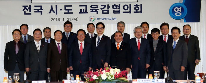 (부산=포커스뉴스) 이준식 교육부 장관이 21일 오후 부산 해운대 그랜드호텔에서 열린 전국 시·도교육감협의회 총회에 참석해 기념촬영 하고 있다. <사진제공=교육부>