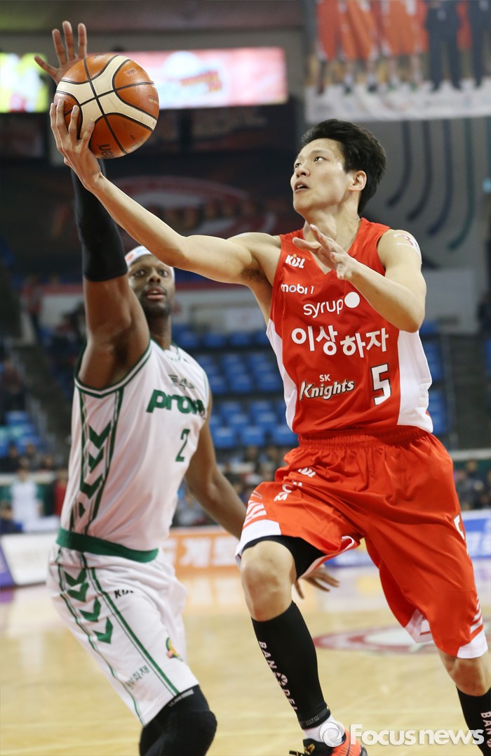 (서울=포커스뉴스) 21일 서울 잠실학생체육관에서 열린 2015-2016 프로농구 SK-동부 경기에서 SK 김선형이 동부 벤슨의 마크를 받으며 레이업슛을 시도하고 있다.