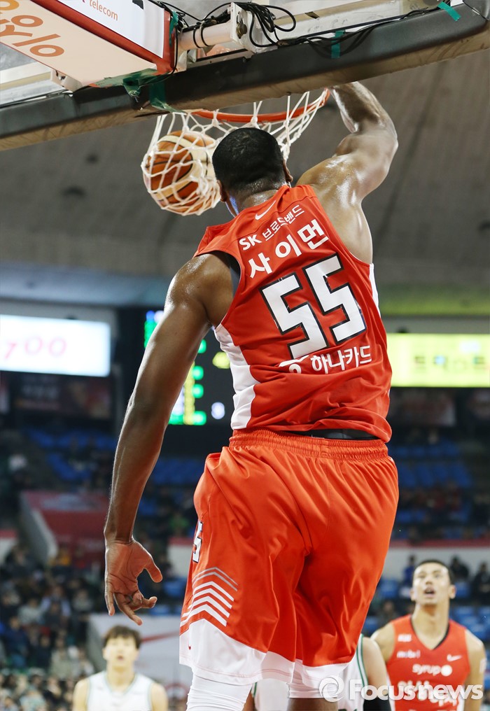 (서울=포커스뉴스) 21일 서울 잠실학생체육관에서 열린 2015-2016 프로농구 SK-동부 경기에서 SK 사이먼이 원핸드 덩크슛을 성공시키고 있다.