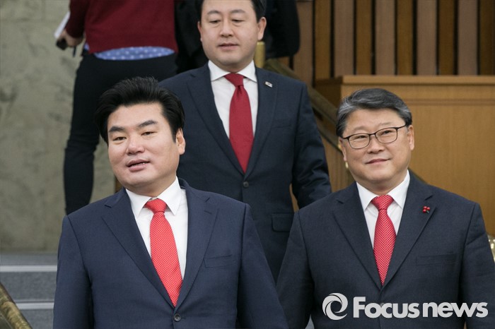 (서울=포커스뉴스) 원유철(왼쪽) 새누리당 원내대표와 조원진(오른쪽) 원내수석부대표가 22일 오전 서울 여의도 국회에서 열린 원내대책회의에 참석하고 있다.