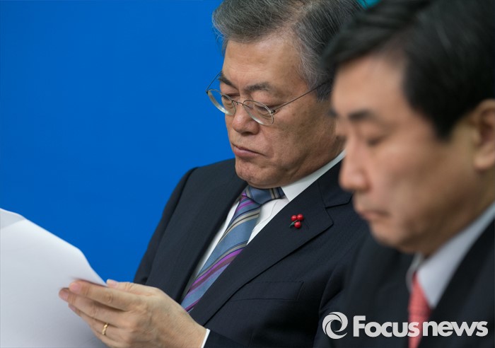 (서울=포커스뉴스) 문재인 더불어민주당 대표가 22일 오전 서울 여의도 국회에서 열린 최고위원회의에 참석해 자료를 살펴보고 있다. 오른쪽은 이종걸 원내대표.