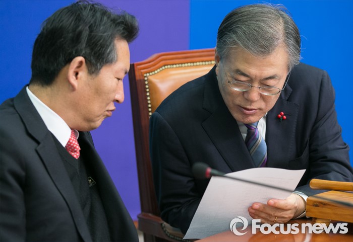 (서울=포커스뉴스) 문재인(오른쪽) 더불어민주당 대표와 정청래 최고위원이 22일 오전 서울 여의도 국회에서 열린 최고위원회의에 참석해 대화하고 있다.