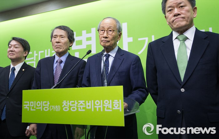 (서울=포커스뉴스) 국민의당(가칭) 창당준비위원회 공동 위원장직을 수락한 후 2주 만에 모습을 드러낸 윤여준 전 장관이 22일 오전 서울 마포구 국민의당 당사에서 기자회견을 하고 있다. (오른쪽 두번째 부터) 윤여준 전 장관, 한상진 공동창준위원장, 안철수 인재영입위원장