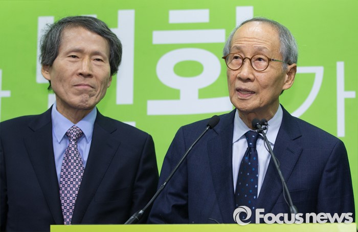 (서울=포커스뉴스) 국민의당(가칭) 창당준비위원회 공동 위원장직을 수락한 후 2주 만에 모습을 드러낸 윤여준 전 장관(오른쪽)이 22일 오전 서울 마포구 국민의당 당사에서 기자회견을 하고 있다.