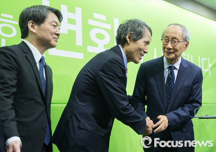 (서울=포커스뉴스) 국민의당(가칭) 창당준비위원회 공동 위원장직을 수락한 후 2주 만에 모습을 드러낸 윤여준 전 장관이 22일 오전 서울 마포구 국민의당 당사에서 기자회견을 마친 후 한상진 공동창준위원장과 인사를 나누고 있다.