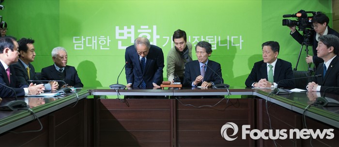 (서울=포커스뉴스) 국민의당(가칭) 창당준비위원회 위원장직을 수락한 후 2주 만에 모습을 드러낸 윤여준 전 장관이 20일 오전 서울 마포구 국민의당(가칭) 당사에서 열린 기획조정회의에 참석해 인사하고 있다. (왼쪽부터) 김한길 상임 부위원장, 윤여진 공동 창준위원장, 한상진 공동창준위원장, 주승용 의원, 안철수 인재영입위원장.