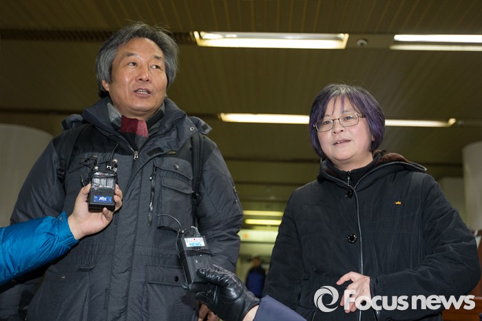 (서울=포커스뉴스) 세월호 집회·시위를 주도한 혐의로 재판에 넘겨진 박래군(왼쪽) 4·16연대 상임운영위원과 김혜진 운영위원이 22일 오전 서울 서초구 서울중앙지방법원에서 열린 선고공판에 출석하기 위해 들어서며 취재진의 질문에 답하고 있다.