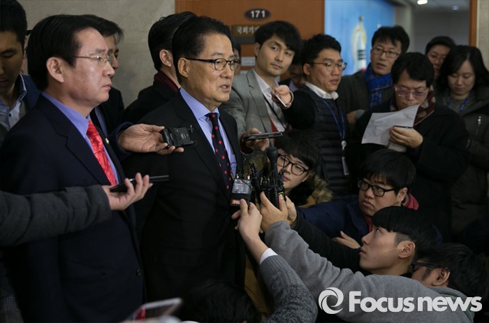 (서울=포커스뉴스) 박지원 더불어민주당 의원이 22일 오전 서울 여의도 국회 정론관에서 탈당 기자회견을 마친 뒤 취재진 질문에 답하고 있다.