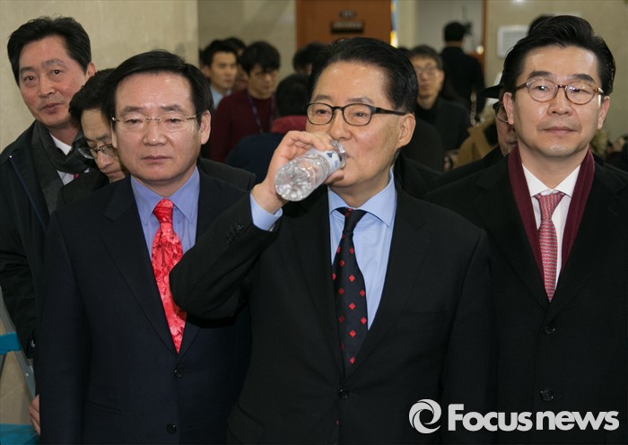 (서울=포커스뉴스) 박지원 더불어민주당 의원이 22일 오전 서울 여의도 국회 정론관에서 탈당 기자회견을 마친 뒤 이동하며 물을 마시고 있다.