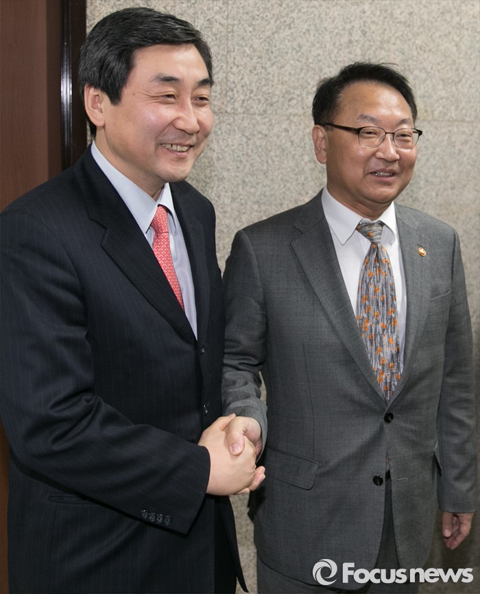 (서울=포커스뉴스) 유일호(오른쪽) 경제부총리 겸 기획재정부 장관이 22일 오전 서울 여의도 국회를 방문해 이종걸 더불어민주당 원내대표와 비공개 면담한 뒤 취재진을 향해 포즈를 취하고 있다.