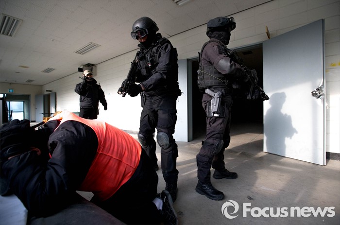 22일 오후 서울 경찰특공대 훈련장에서 테러상황에 대비한 경찰, 소방, 군 전력이 함께 한 합동훈련이 실시된 가운데 경찰 특공대 대원들이 테러범에 의한 인질상항 등을 가정한 훈련을 진행하고 있다.