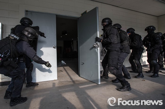 (서울=포커스뉴스) 22일 오후 서울 경찰특공대 훈련장에서 테러상황에 대비한 경찰, 소방, 군 전력이 함께 한 합동훈련이 실시된 가운데 경찰특공대 대원들이 테러범에 의한 인질상항 등을 가정한 훈련을 진행하고 있다.