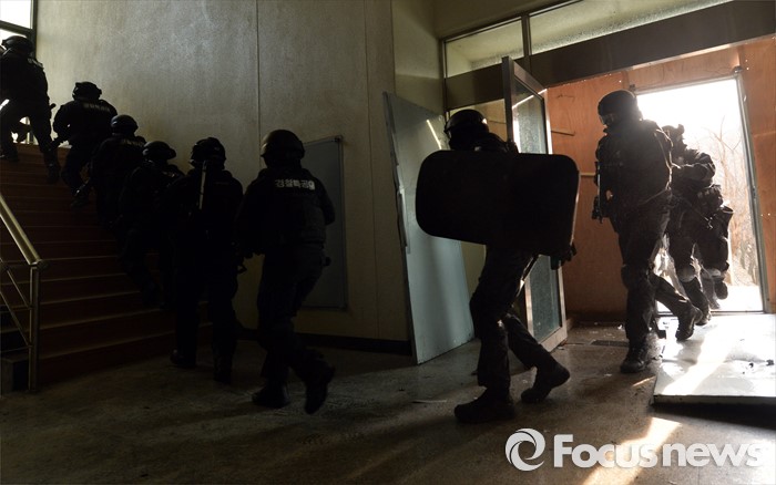(서울=포커스뉴스) 김신조 청와대 침투사건인 ‘1·21사태’ 48주년을 맞아 서울경찰청·소방재난본부·수도방위사령부가 합동으로 수도 서울을 지키기 위한 테러 진압 훈련을 실시한 22일 서울 서초구 경찰특공대 훈련장에서 군 테러 진압 부대와 경찰특공대 대원들이 인질범 진압 작전을 펼치고 있다.