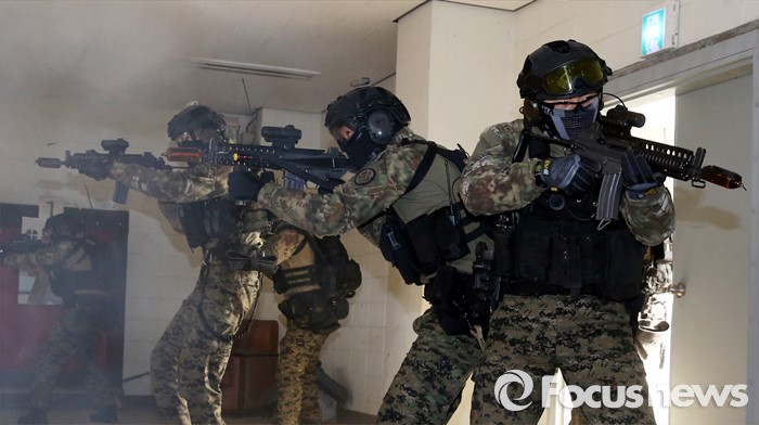 (서울=포커스뉴스) 김신조 청와대 침투사건인 ‘1·21사태’ 48주년을 맞아 서울경찰청·소방재난본부·수도방위사령부가 합동으로 수도 서울을 지키기 위한 테러 진압 훈련을 실시한 22일 서울 서초구 경찰특공대 훈련장에서 군 테러 진압 부대가 인질범 진압 작전을 펼치고 있다.