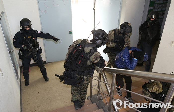 (서울=포커스뉴스) 김신조 청와대 침투사건인 ‘1·21사태’ 48주년을 맞아 서울경찰청·소방재난본부·수도방위사령부가 합동으로 수도 서울을 지키기 위한 테러 진압 훈련을 실시한 22일 서울 서초구 경찰특공대 훈련장에서 군 테러 진압 부대가 인질범 진압 작전을 펼치고 있다.