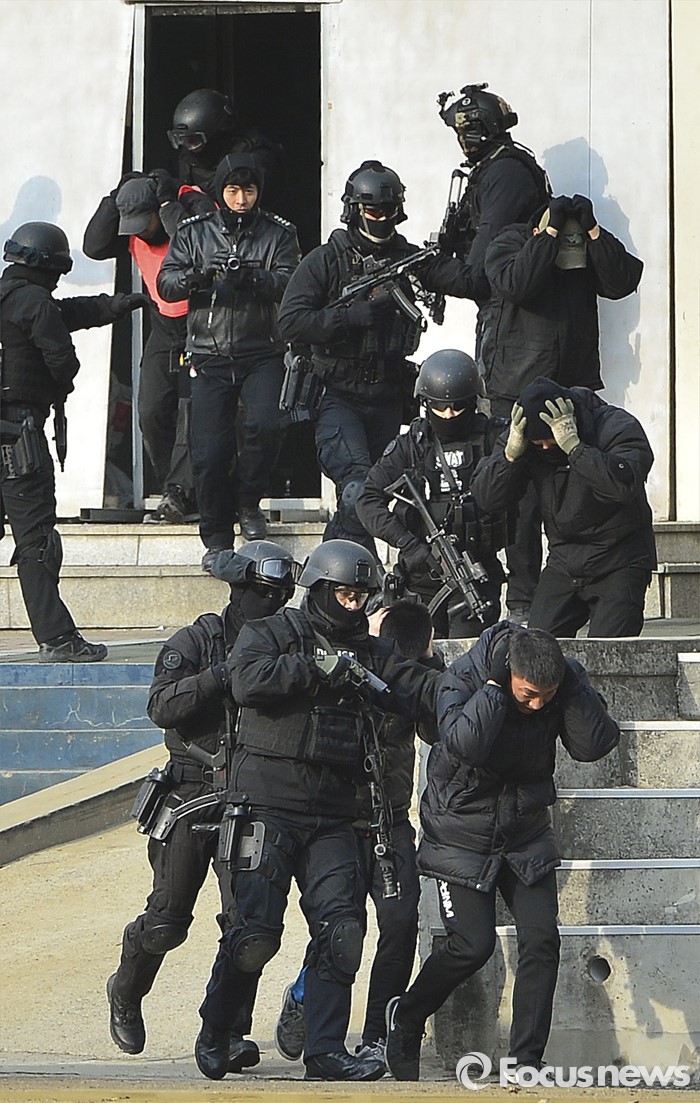 (서울=포커스뉴스) 22일 오후 서울 서초구 서울경찰특공대 훈련장에서 열린 경찰·군·소방 대테러 합동훈련에서 특공대원들이 인질범 제압 훈련을 하고 있다.