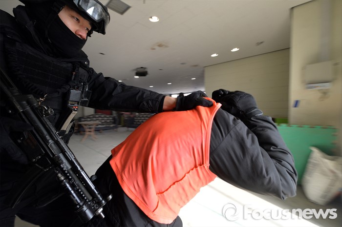 (서울=포커스뉴스) 김신조 청와대 침투사건인 ‘1·21사태’ 48주년을 맞아 서울경찰청·소방재난본부·수도방위사령부가 합동으로 수도 서울을 지키기 위한 테러 진압 훈련을 실시한 22일 서울 서초구 경찰특공대 훈련장에서 군 테러 진압 부대와 경찰특공대 대원들이 인질범 진압 작전을 펼치고 있다.