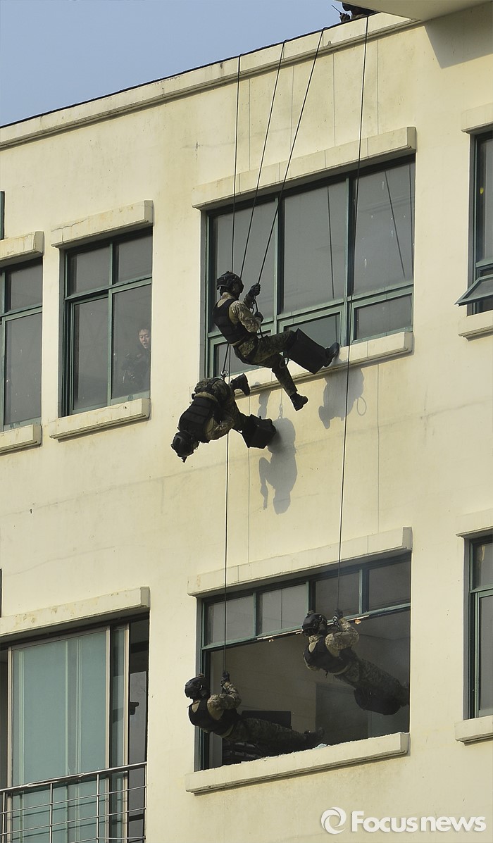 (서울=포커스뉴스) 22일 오후 서울 서초구 서울경찰특공대 훈련장에서 열린 경찰·군·소방 대테러 합동훈련에서 특공대원들이 인질범 제압 훈련을 하고 있다.