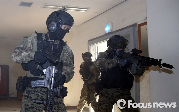 (서울=포커스뉴스) 김신조 청와대 침투사건인 ‘1·21사태’ 48주년을 맞아 서울경찰청·소방재난본부·수도방위사령부가 합동으로 수도 서울을 지키기 위한 테러 진압 훈련을 실시한 22일 서울 서초구 경찰특공대 훈련장에서 군 테러 진압 부대가 인질범 진압 작전을 펼치고 있다.