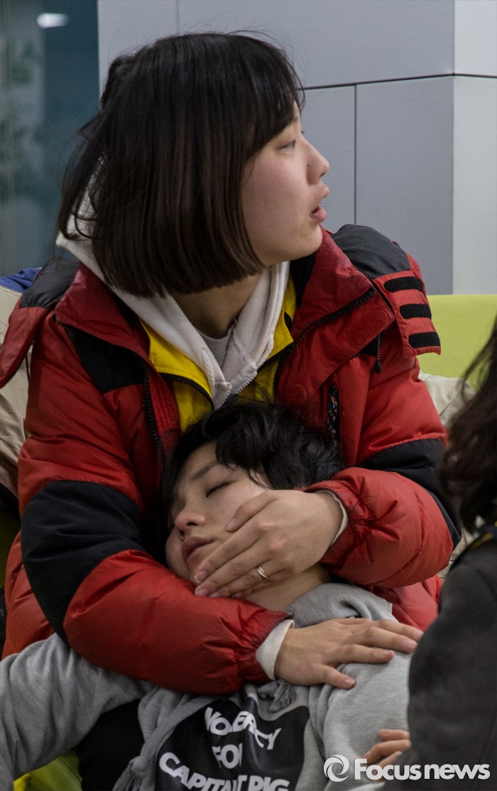 (서울=포커스뉴스) 22일 오후 서울 중구 서울고용노동청을 민원실을 점거한 알바노조원들이 경찰과 충돌, 한 노조원이 정신을 잃고 동료 품에 안겨 있다. 알바노조 조합원 100여명은 근로감독관 일처리 개선을 촉구하며 노동청을 기습 점거했다.