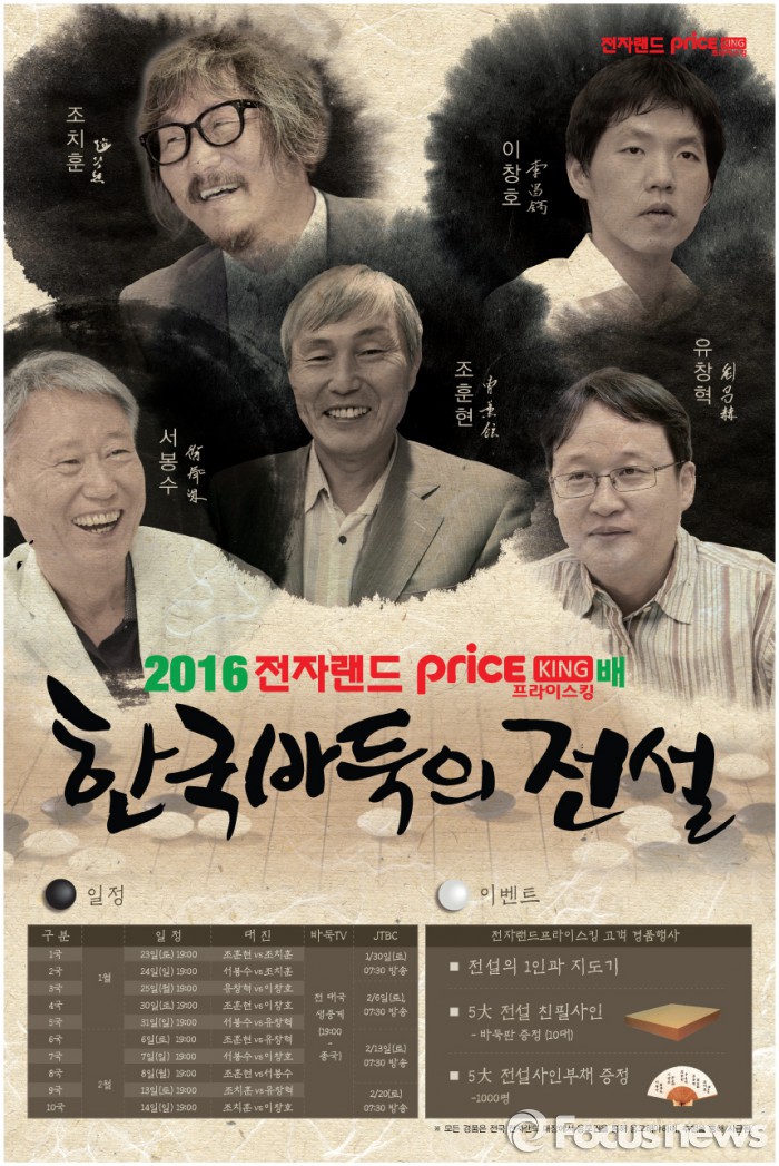 답사에 나선 박치문 부총재는 "드라마 '응답하라 1988'의 영향으로 바둑에 대한 관심이 늘었다"며 "이번 대회가 세계 최강 한국바둑의 위상을 이어 나갈 수 있는 토대가 되기를 기대한다"고 말했다.22일 오후 그랜드힐튼서울에서 열린 '한국 바둑의 전설' 대회 개막식에서 (왼쪽부터) 조훈현 9단, 서봉수 9단, 조치훈 9단, 유창혁 9단, 이창호 9단이 기념 사진을 찍고 있다. <사진제공=한국기원> 2016.1.22. 김현이 인턴기자 '전자랜드 프라이스킹배 한국 바둑의 전설' 대회 포스터 <사진제공=전자랜드> 2016.1.22. 김현이 인턴기자