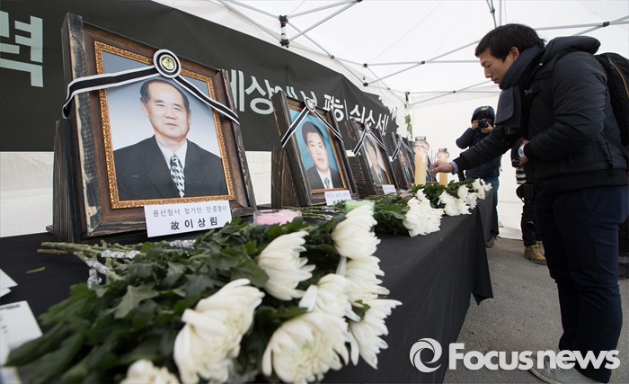 (서울=포커스뉴스) 23일 오후 서울 용산참사가 일어났던 용산4구역 재개발 지역에 설치된 '용산참사 7주기 추모대회' 분향소에서 시민들이 헌화를 하고 있다.