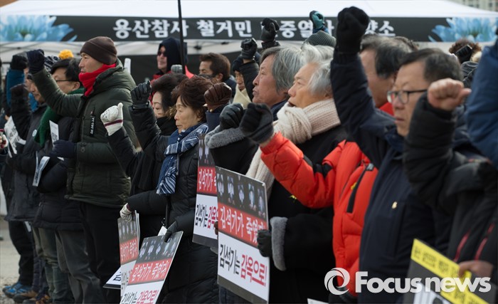 (서울=포커스뉴스) 23일 오후 서울 용산참사가 일어났던 용산4구역 재개발 지역에서 열린 '용산참사 7주기 추모대회'에 유족들을 비롯한 당시에 같이 망루에서 활동했던 생존자들이 참석하고 있다.