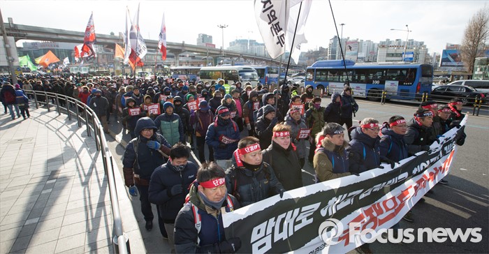 (서울=포커스뉴스) 23일 오후 서울역 광장에서 열린 '민주노총 총파업 선포대회'에서 전국민주노동조합총연맹 회원들이 도심을 향해 행진을 하고 있다.