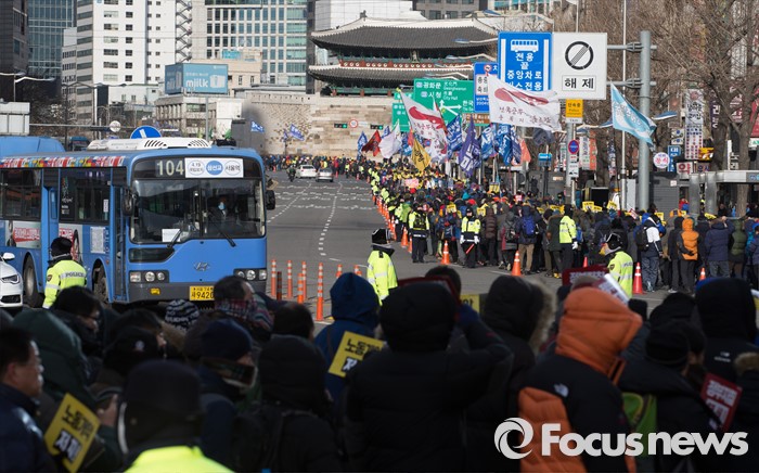 (서울=포커스뉴스) 23일 오후 서울역 광장에서 열린 '민주노총 총파업 선포대회'에서 전국민주노동조합총연맹 회원들이 도심을 향해 행진을 하고 있다.
