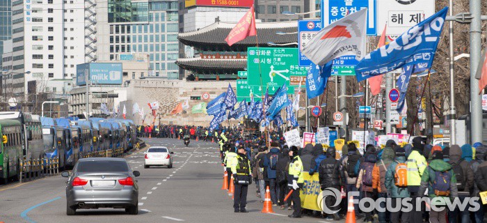 (서울=포커스뉴스) 23일 오후 서울역 광장에서 열린 '민주노총 총파업 선포대회'에서 전국민주노동조합총연맹 회원들이 도심을 향해 행진을 하고 있다.