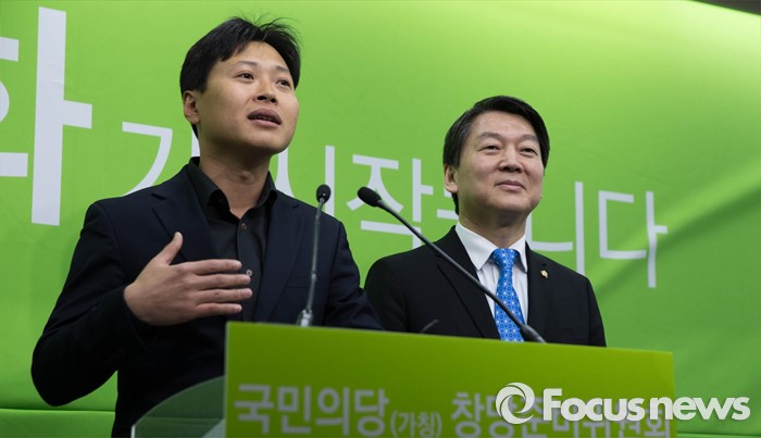 (서울=포커스뉴스) 24일 오전 서울 마포구 국민의당 당사에서 곽선우(왼쪽) 변호사가 국민의당 입당을 알리며 발언하고 있다.