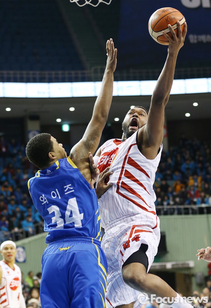 (서울=포커스뉴스) 24일 서울 잠실실내체육관에서 열린 2015-2016 프로농구 삼성-오리온 경기에서 오리온 제스펀 존슨이 삼성 와이즈의 마크를 피하며 레이업슛을 시도하고 있다.