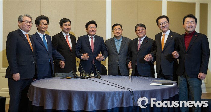 (서울=포커스뉴스) 24일 오후 서울 여의도 국회 귀빈식당에서 선거구획정안과 쟁점법안 처리를 위해 새누리당, 더불어민주당 원내지도부가 회동을 갖고 취재진을 향해 포즈를 취하고 있다. 왼쪽부터 더불어민주당 김용익 의원, 더불어민주당 이목희 정책위의장, 더불어민주당 이종걸 원내대표, 새누리당 원유철 원내대표, 새누리당 김정훈 정책위의장, 새누리당 조원진 원내수석부대표, 새누리당 강석훈 의원, 새누리당 김용남 원내대변인.