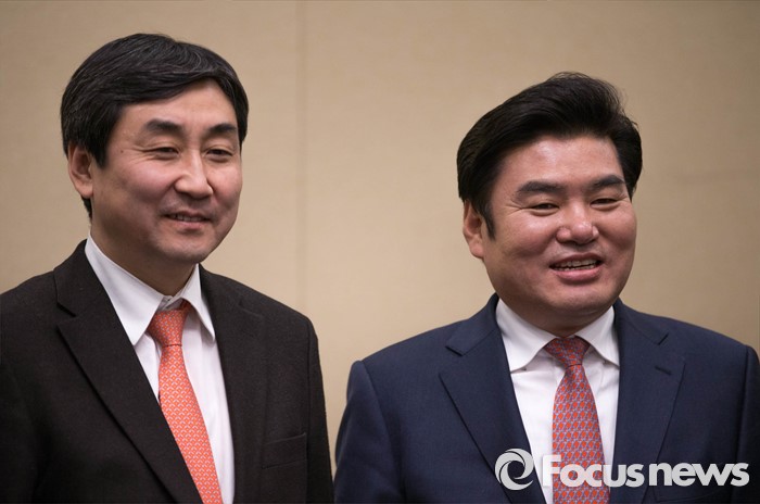 (서울=포커스뉴스) 새누리당 원유철(오른쪽), 더불어민주당 이종걸 원내대표가 24일 오후 서울 여의도 국회 귀빈식당에서 선거구획정안과 쟁정법안을 처리하기 위한 회동에 참석, 취재진을 향해 웃고 있다.