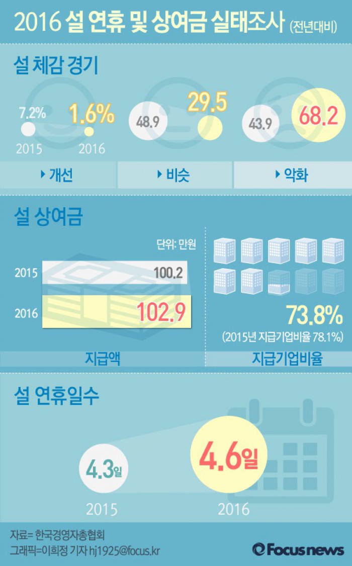 (서울=포커스뉴스) 한국경영자총협회에서 24일 발표한 '2016년 설 연휴 및 상여금 실태조사'에 따르면 올해 설 상여금을 지급할 계획이 있는 기업은 73.8%였고 지급액수는 소폭 늘어난 102만 9천원 이다. 설 연휴 일수는 평균 4.6일로 지난해보다 0.3일 증가할 것으로 보인다.