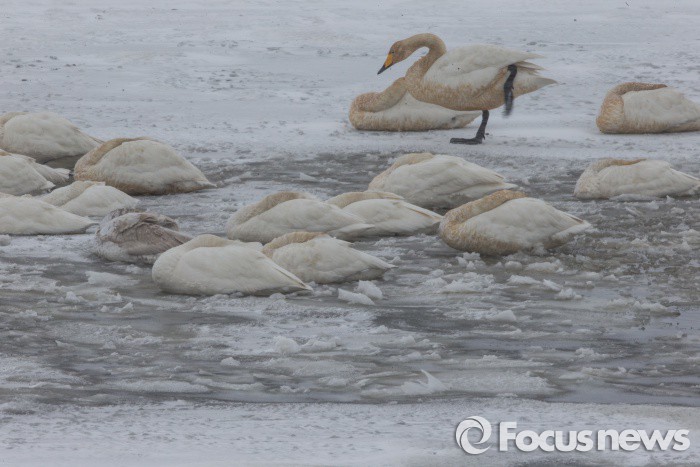 (서산=포커스뉴스) 한파특보가 계속되고 있는 25일 오전 충남 서산시 천수만에서 큰고니(천연기념물201호) 들이 얼어붙은 해미천의 눈밭에서 머리를 깃털속에 처박고 추위를 피하고 있다.
