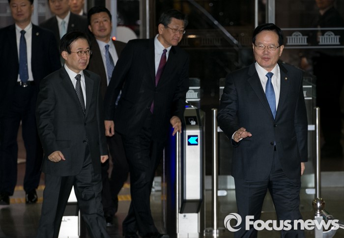 (서울=포커스뉴스) 정의화 국회의장이 25일 오전 서울 여의도 국회로 출근하며 취재진 질문을 받고 있다. 이날 새누리당 초·재선 의원 모임인 '아침소리'는 정 의장이 20대 총선 불출마 선언을 해야한다는 주장을 제기했다.