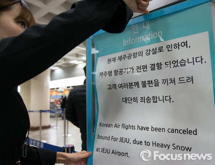 (서울=포커스뉴스) 25일 오전 서울 김포공항 국내선 청사에서 항공사 관계자가 제주와 김포로 오가는 항공편의 결항 안내문을 게시하고 있다.