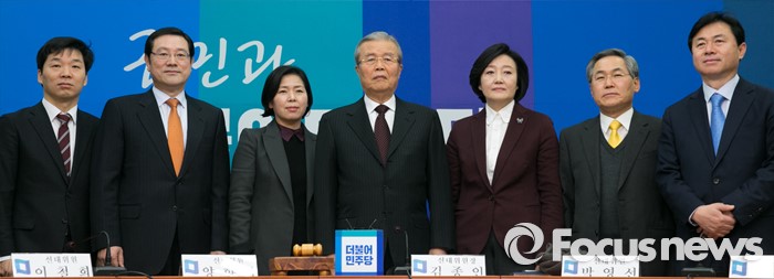 (서울=포커스뉴스) 25일 오전 서울 여의도 국회에서 열린 더불어민주당 1차 중앙선거대책위원회의에 참석한 김종인 위원장과 선대위원들이 취재진을 향해 포즈를 취하고 있다. 왼쪽부터 김병관, 이용섭, 양향자 선대위원, 김 위원장, 박영선, 우윤근, 김영춘 선대위원.