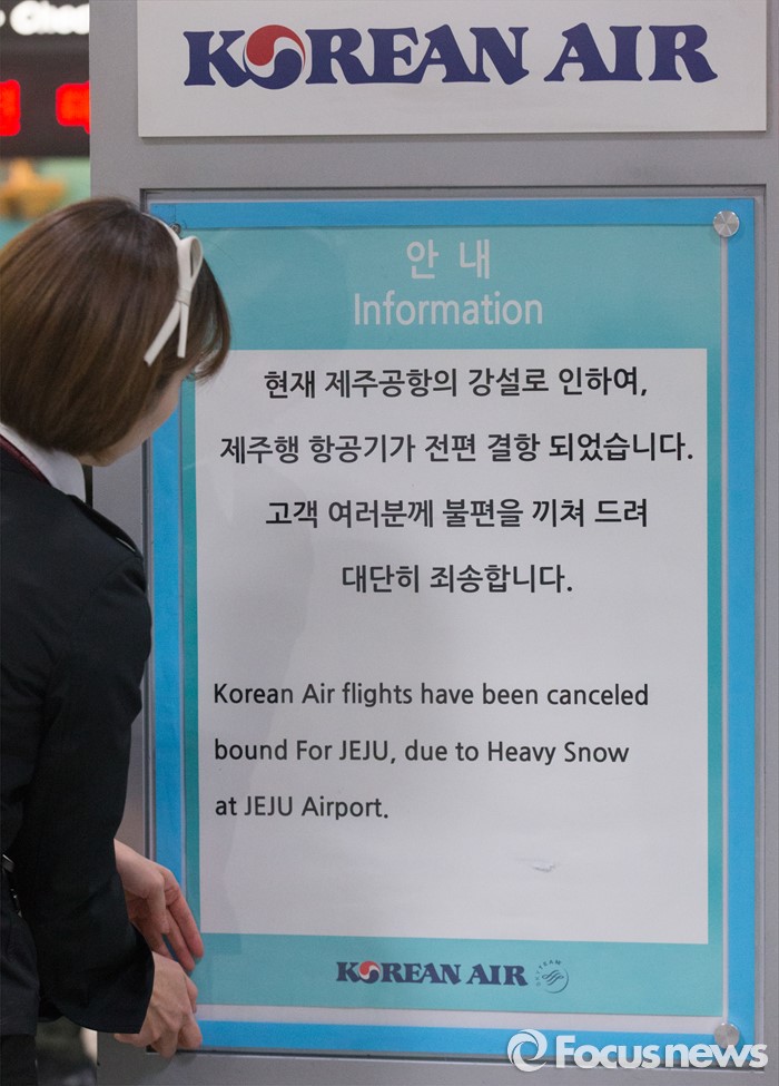 (서울=포커스뉴스) 25일 오전 서울 김포공항 국내선 청사에서 항공사 관계자가 제주와 김포로 오가는 항공편의 결항 안내문을 게시하고 있다.