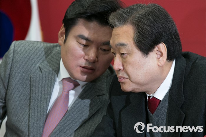 (서울=포커스뉴스) 김무성(오른쪽) 새누리당 대표와 원유철 원내대표가 25일 오전 서울 여의도 국회에서 열린 최고위원회의에 참석해 대화하고 있다.