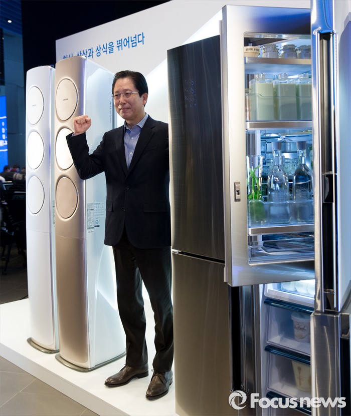 (서울=포커스뉴스) 25일 오전 서울 서초구 삼성딜라이트에서 서병삼 삼성전자 생활가전사업부장 부사장이 2016 삼성전자 생활가전 미디어데이에서 무풍에어컨 Q9500(왼쪽)과 셰프컬렉션 냉장고를 선보이고 있다.