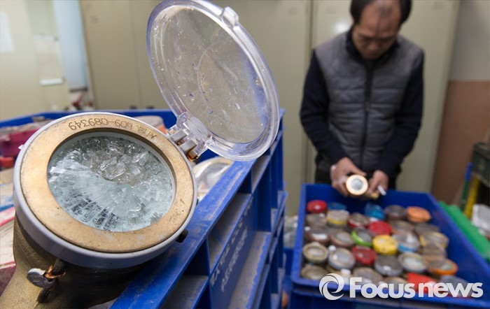 (서울=포커스뉴스) 15년 만에 찾아온 강력한 한파가 연일 계속되고 있는 25일 오전 서울 강남수도사업소에서 직원이 동파된 수도계량기를 정리하고 있다.