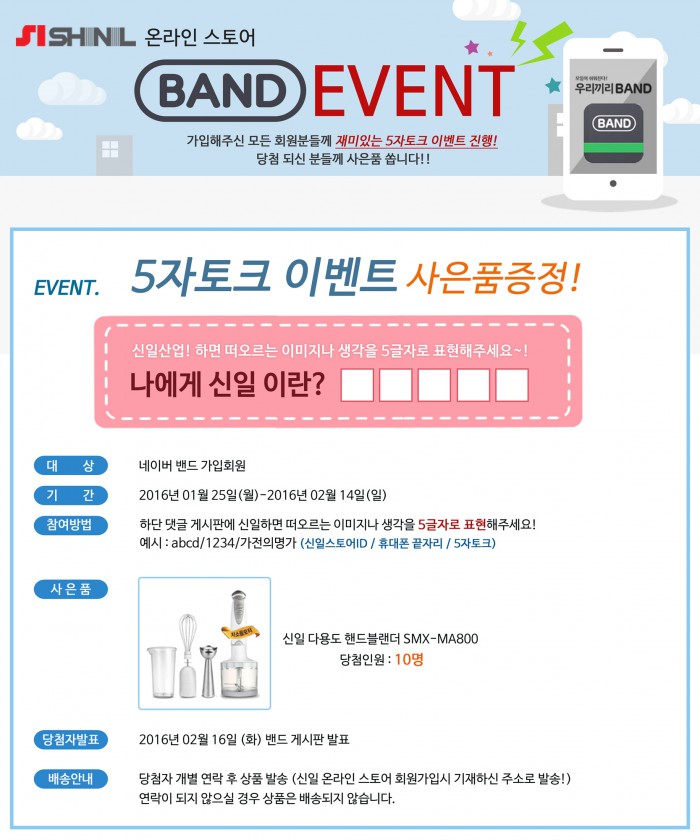 신일산업 고객만의 기발하고 독특한 생각을 확인할 수 있는 '5자 토크 이벤트'도 실시한다. 신일산업을 떠올렸을 때 생각나는 이미지나 생각을 5글자로 표현하는 행사다. 당첨자는 다음달 16일 밴드 채널을 통해 발표한다. 신일산업은 참여자 중 10명을 선정, 강력한 모터를 자랑하는 다용도 핸드블랜더(SMX-MA800)를 증정할 계획이다.