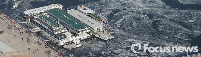 (서울=포커스뉴스) 연일 강추위가 계속되고 있는 25일 오전 서울 영등포구 63빌딩에서 바라본 한강 일대가 얼어붙어 있다.