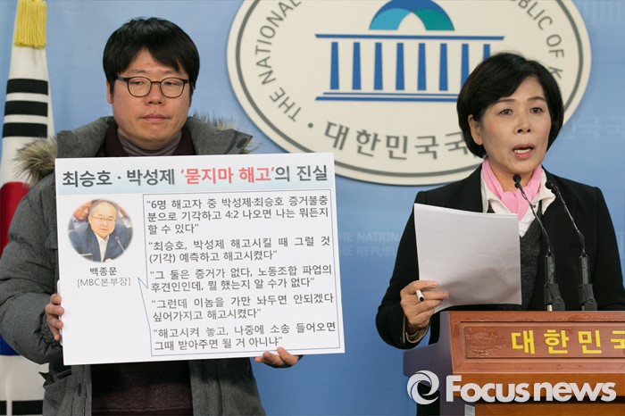 (서울=포커스뉴스) 국회 미래창조과학방송통신위원회 위원인 최민희(오른쪽) 더불어민주당 의원이 25일 오전 서울 여의도 국회 정론관에서 지난 2012년 파업으로 해고된 MBC 최승호 PD, 박성제 기자와 관련된 백종문 MBC 미래전략본부장의 녹취록을 공개하고 있다. 녹취록에서 백 본부장은 '최 PD와 박 기자는 증거 없지만 해고 시킨 것'이라 말했다.